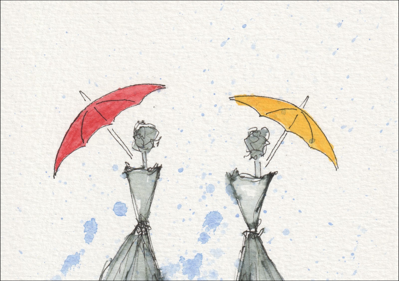 Figurative wall art painting of two women holding umbrellas, in watercolour and ink.
