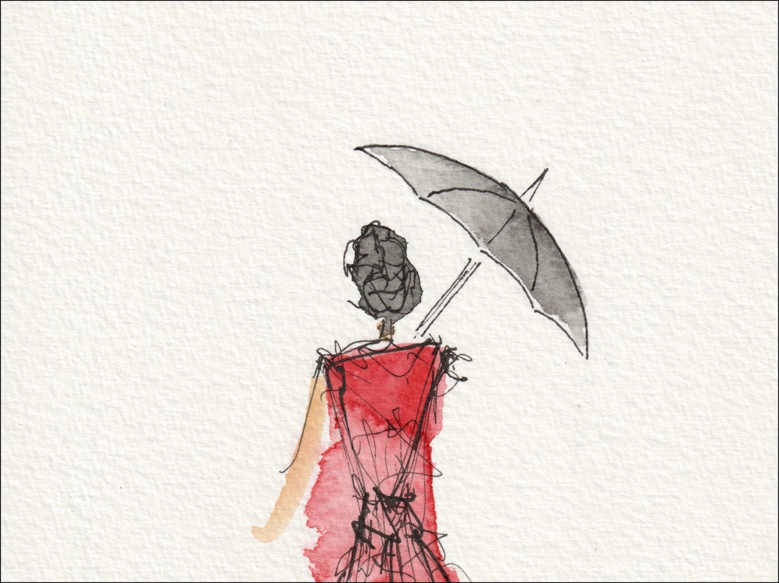 Figurative wall art painting of a woman wearing a red dress holding an umbrella in watercolour and ink.