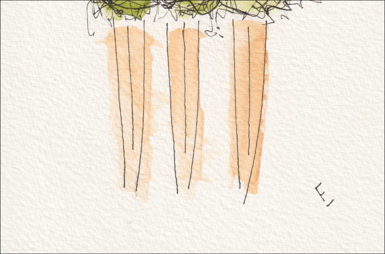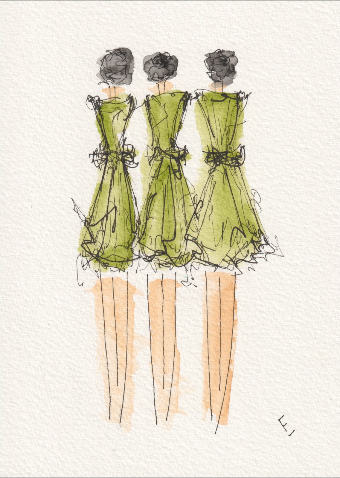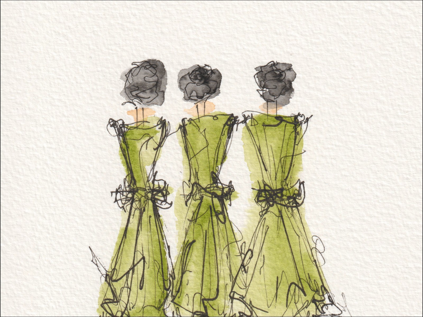 Figurative wall art painting of three women wearing green dresses, in watercolour and ink.