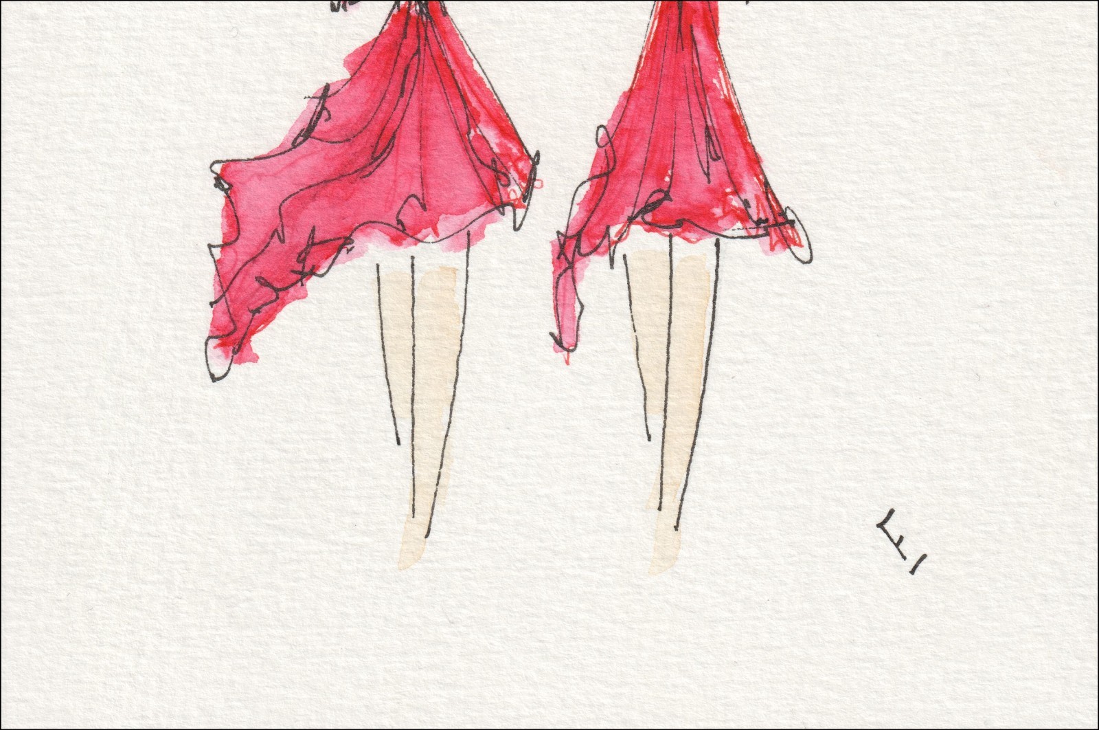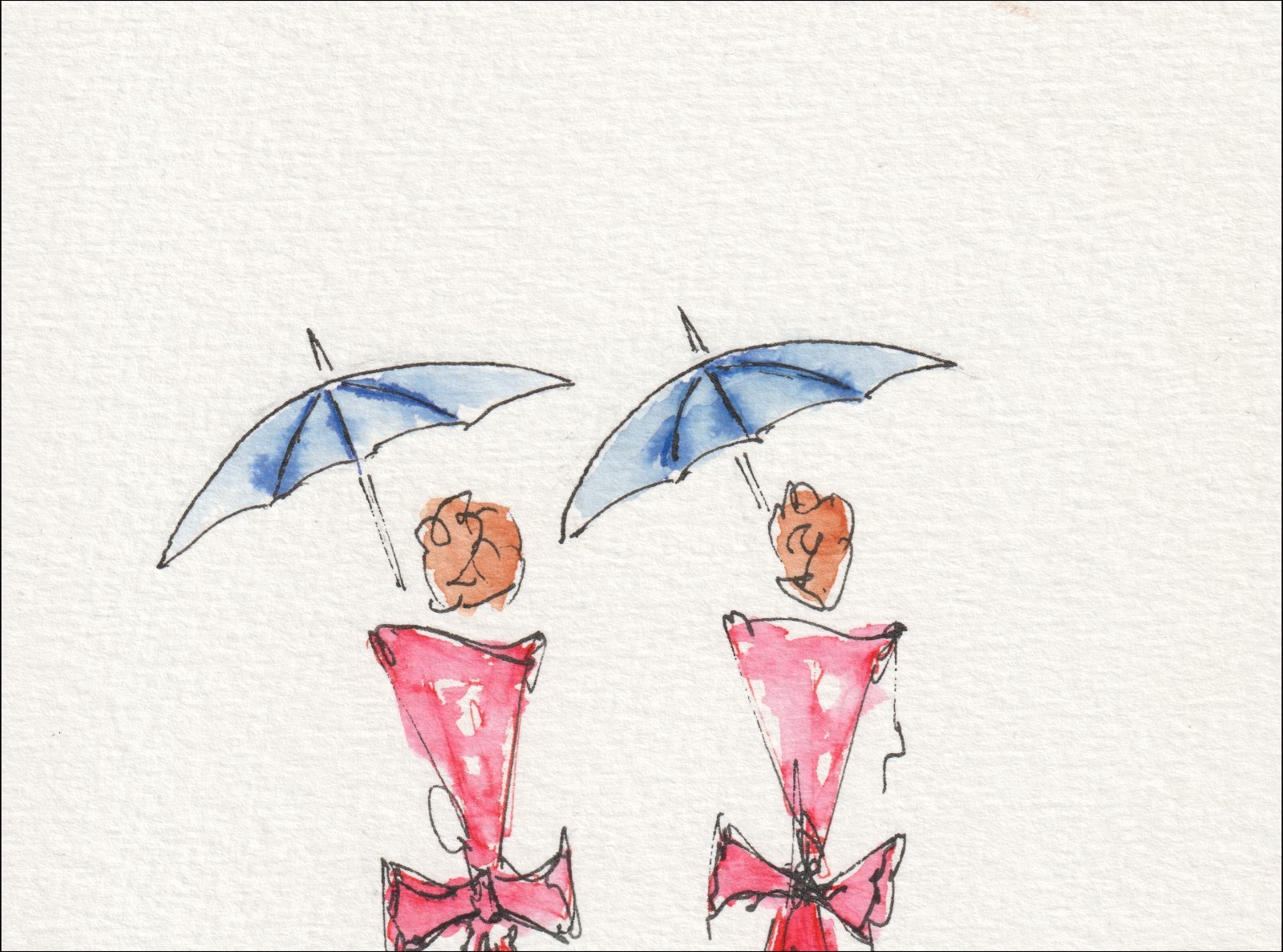 Figurative wall art painting of two women holding umbrellas, in watercolour and ink.