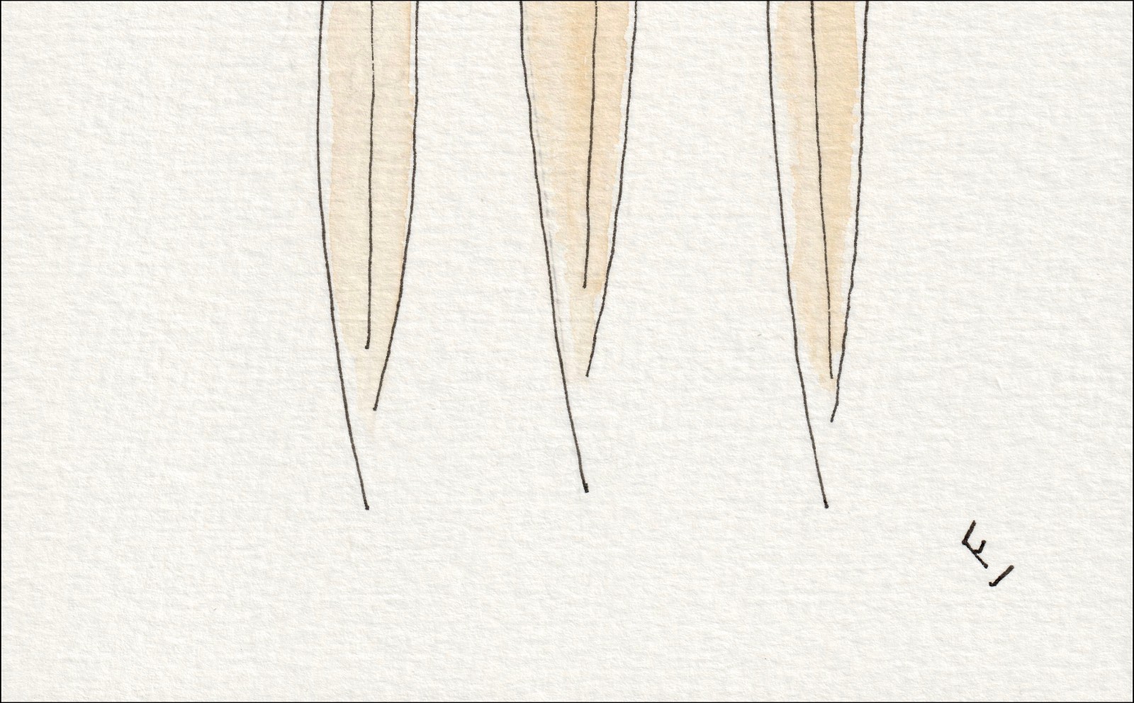 Original figurative painting of three women holding umbrellas, in watercolour and ink.